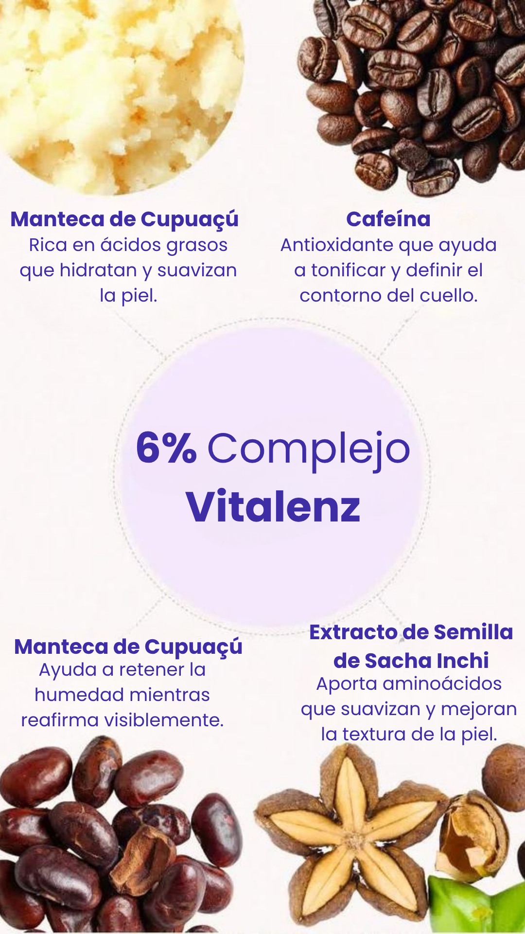 Las cremas faciales comunes no están formuladas para la piel del cuello, que es más fina y propensa a la flacidez. Vitalenz tiene ingredientes específicos para reafirmar y nutrir esta zona delicada.